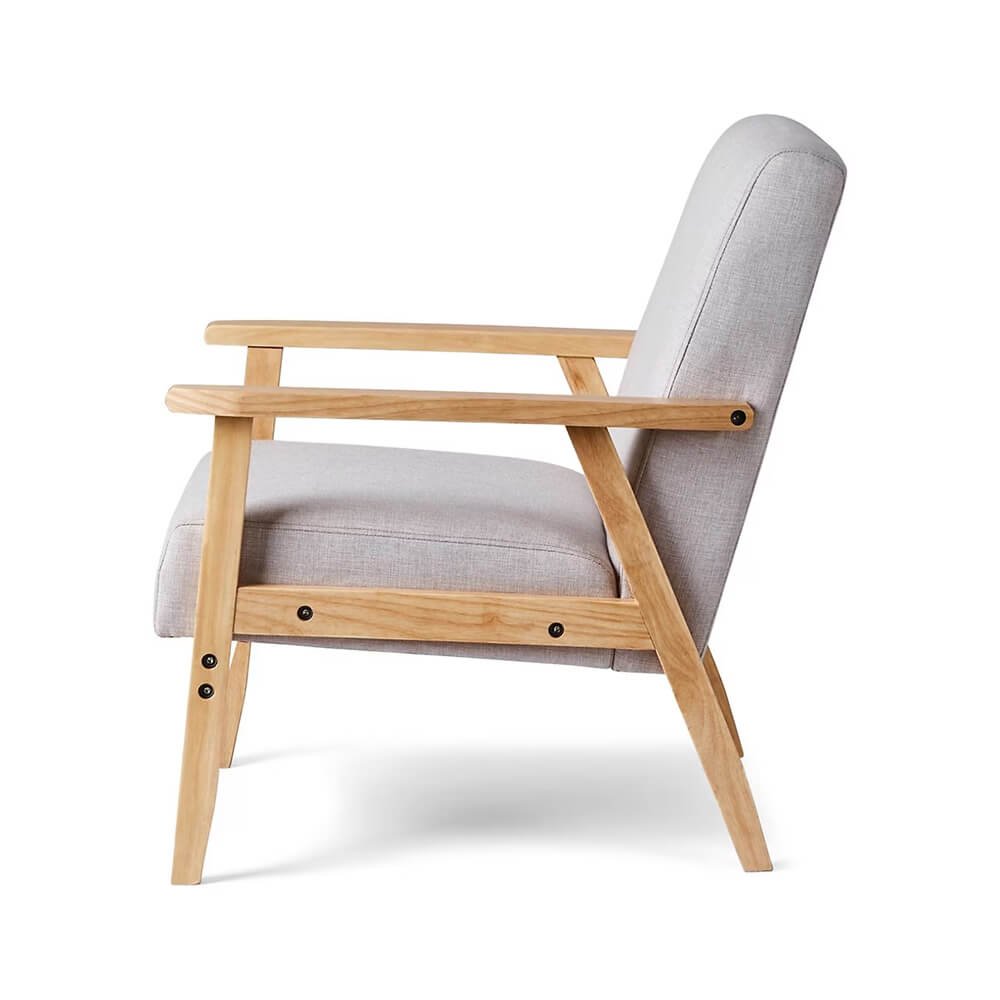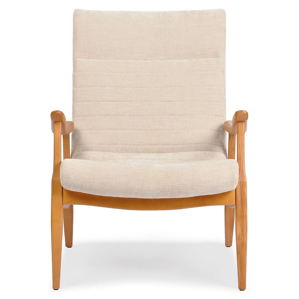 Natural wood, faux leather and a soft linen-like fabric combine in this elegant and warm accent chair. Featuring a pillowy back and a generous seat, Kenari packs good looks and comfort into one modern silhouette.